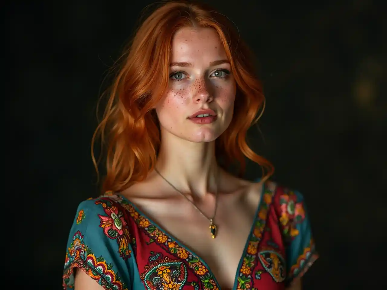 Jacobसुंदर रंगाई वाली महिला, जो रंगीन, जीवंत, विस्तृत कढ़ाई वाली पोशाक पहनती है, मध्य-पूर्ण शॉट, रात में