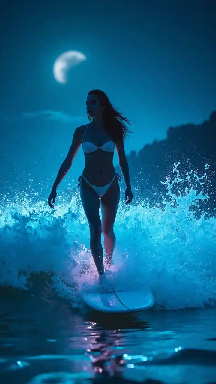 एक जैवप्रकाशित महासागर में एक चमकती लहर पर सर्फ करते हुए, 35 के आसपास की एक सफेद महिला एक चिकनी बिकिनी में चमकती है। चन्द्रमा की रोशनी और चमकते प्लैंकटन ने उसे ढाला, उसका एथलेटिक रूप साहसिक, रहस्यमय सुंदरता से भरा हुआ है।