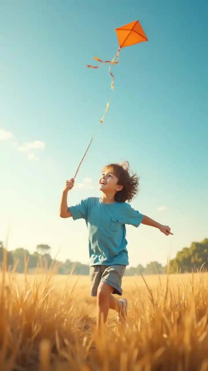 एक लड़के को नीली शर्ट और शॉर्ट्स में, एक पतंग को एक बड़ी मुस्कान के साथ, एक हवा वाले दिन खुले मैदान में दौड़ते हुए कल्पना कीजिए। पतंग उसके ऊपर से उड़ी, और सूरज की हल्की रोशनी एक गर्म, खुश दृश्य बनाता है।