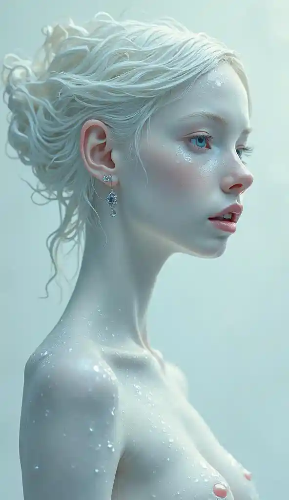 इस अतिवास्तविक, उच्च शैलीकृत चित्र में एक युवा महिला के ऊपरी हिस्से को तीक्ष्ण, अन्य दुनिया के रूप में चित्रित किया गया है। उसकी चीनी मिट्टी की त्वचा बर्फ की तरह चमकती है, और h