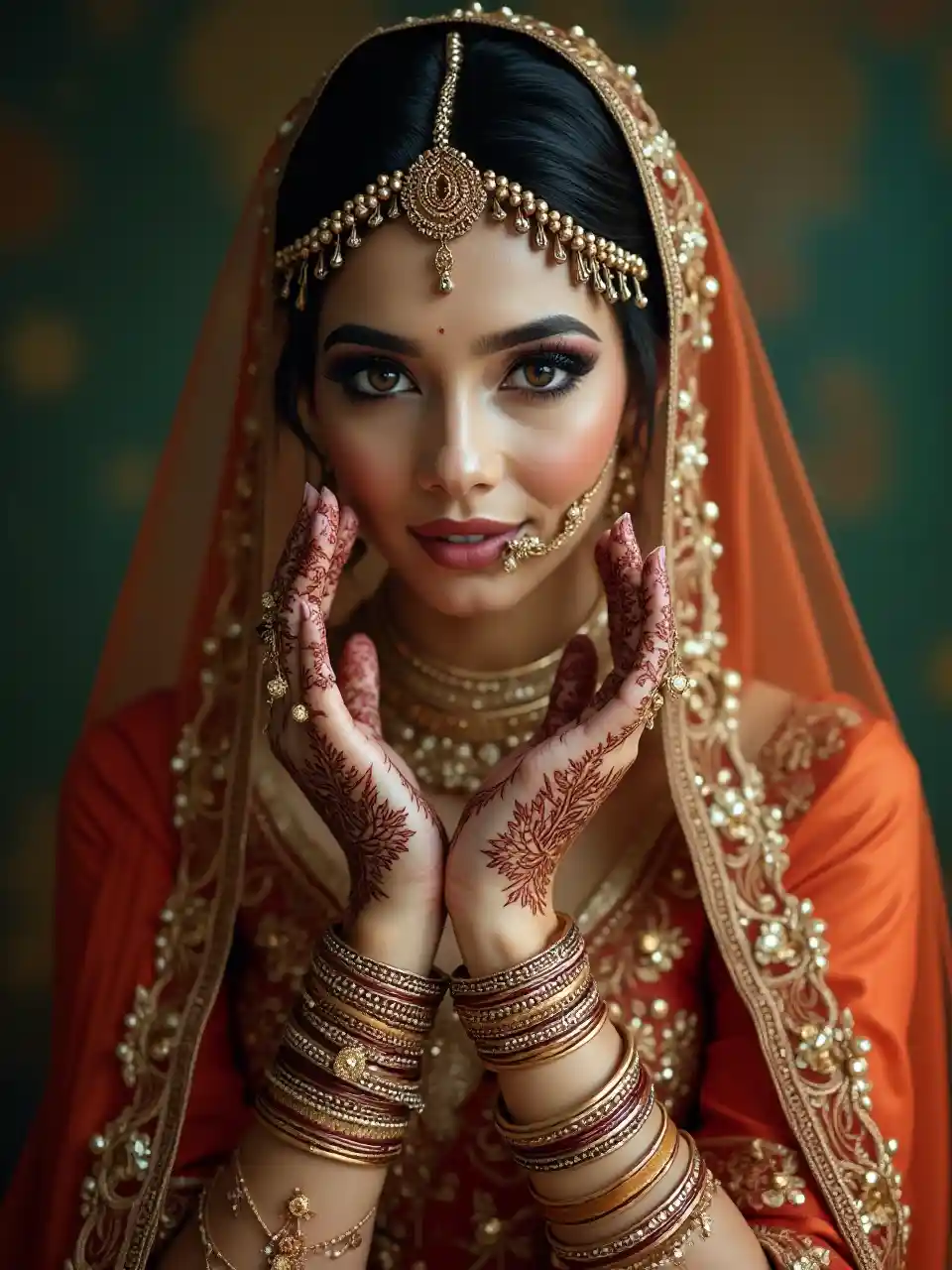 एक आकर्षक भारतीय दुल्हन ने पारंपरिक पोशाक में सजावट की, अपने हाथों पर जटिल विस्तृत हेन डिजाइनों का प्रदर्शन किया। दृश्य एक चौड़ा कोण लेंस के माध्यम से फ्रेम किए गए अति-विस्तृत और अति-वास्तविक बनावट के साथ फोटोरियलिज्म को पकड़ता है। प्रकाश व्यवस्था में उच्च-विपरीत छायांकन दिखाई देता है, जैसे कि 70 मिमी की फिल्म पर शूट किया गया है, जिसमें भारतीय प्रेरणा के कारणों का एक टेपेस्ट्री है। रंग पैलेट में गहरे पीले रंग के रंगों का मिश्रण होता है। गहरे लाल रंग का एक रंग टर्किज़ रंग के साथ मिलकर एक शानदार दृश्य बना देता है, जो सभी उच्च परिभाषा में प्रस्तुत किए जाते हैं।