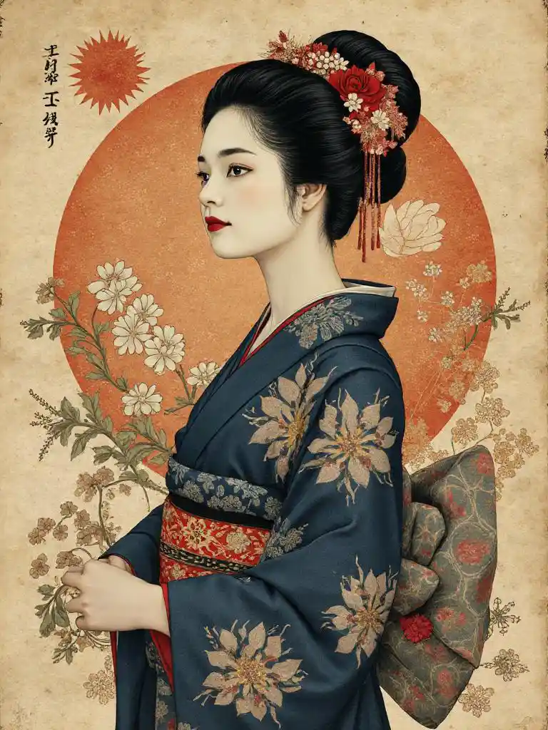 Rileyपारंपरिक हिशी (हीरा के आकार के) पैटर्न के साथ एक नौसेना किमोनो में एक जापानी महिला की विशेषता वाला कलात्मक विंटेज कोलाज, प्राचीन कागज बनावट से घिरा हुआ है, फैड