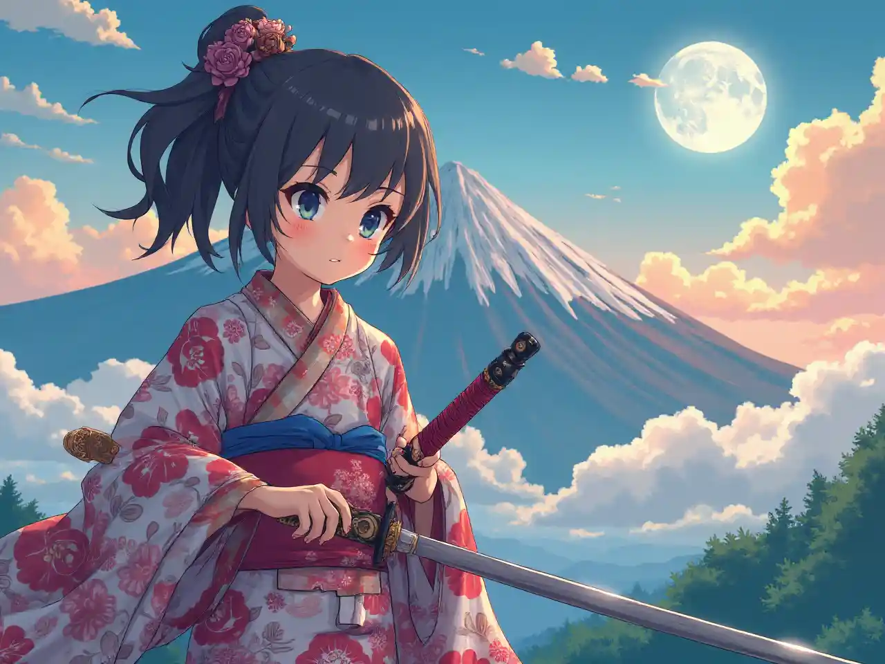 Coltonदूर में एक किमोनो में जापानी तलवार की चौड़ाई वाली जापानी लड़की, बादल और चंद्रमा पृष्ठभूमि में हैं। मियाजाकी जापान कार्टून शैली विवरण स्पष्ट, तेज और रंगीन उच्च संकल्प छवि