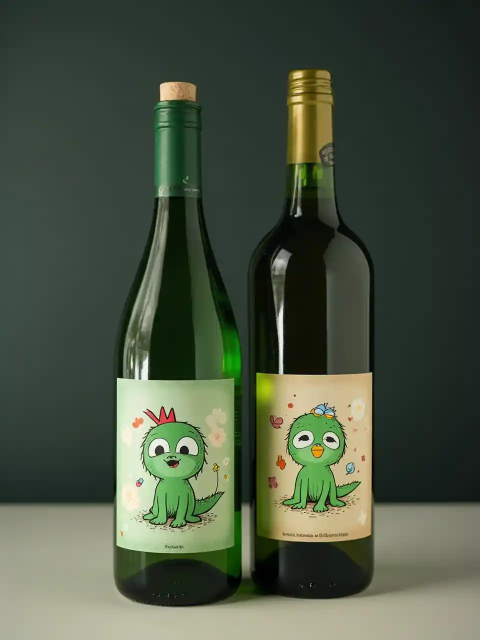 Zoeदो बोतलें लाल शराब के साथ लेबल एक बच्चे द्वारा चित्रित खुश चेहरे और रंगों के साथ रंगों के पात्र, स्पार्कलिंग ग्रीन और सख्त ग्रीन सेट पेशेवर न्यूनतम पृष्ठभूमि के साथ