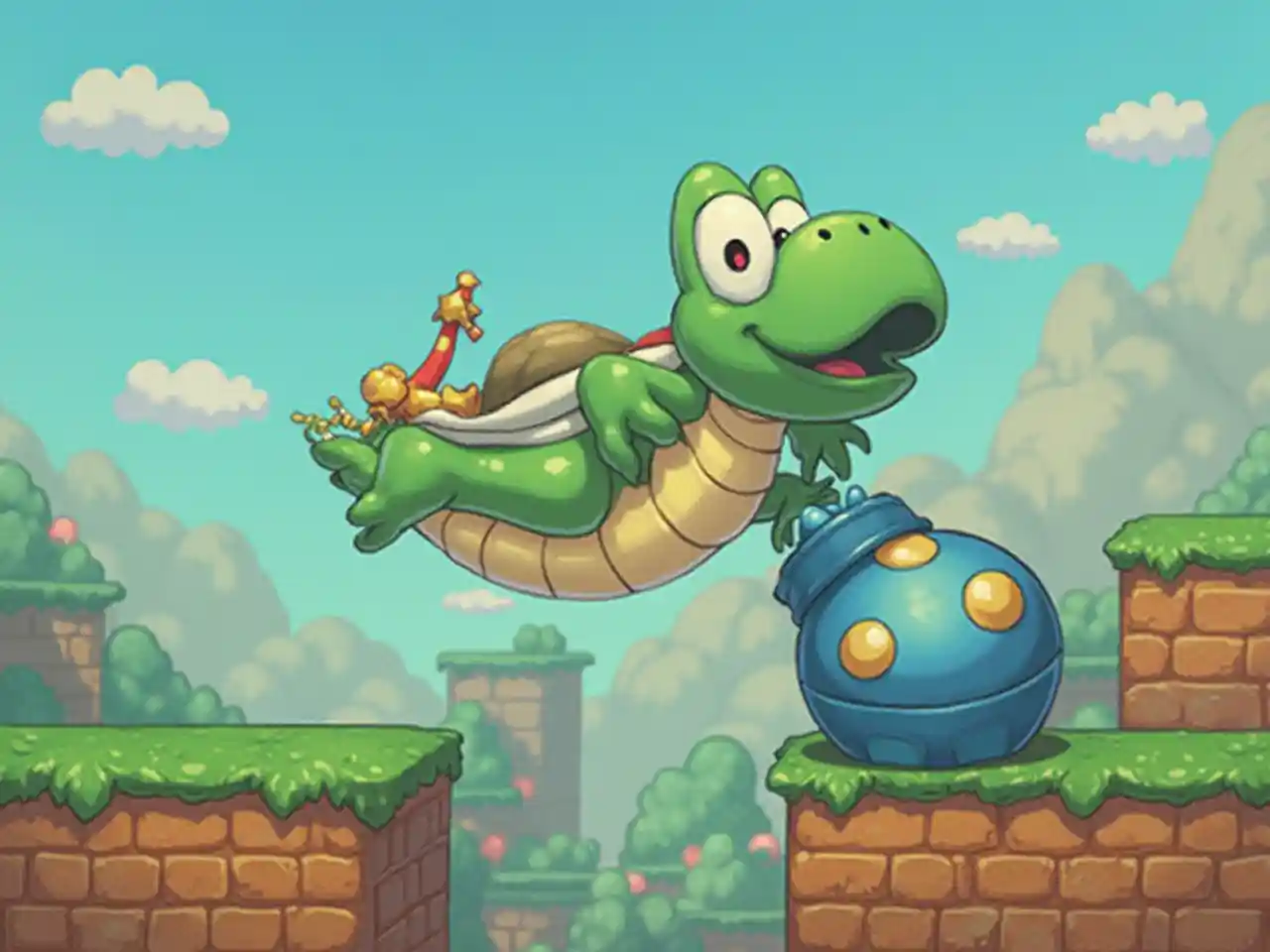 सुपर मारियो शैली में एक नीले खोल पर कूदता है।