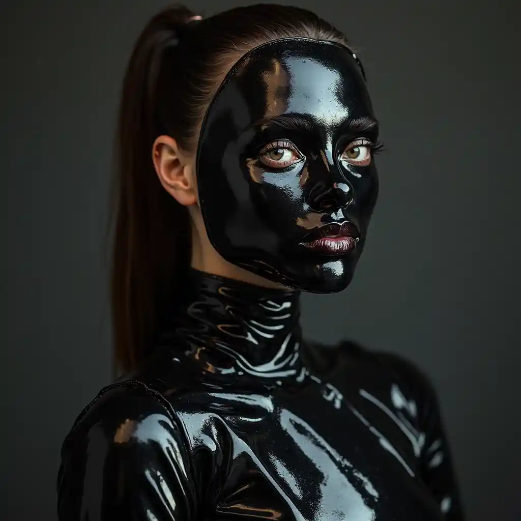 Avaपूर्ण लेटेक्स मुखौटा वाली लड़की, पूरी तरह से चमकदार रबर से ढकी हुई