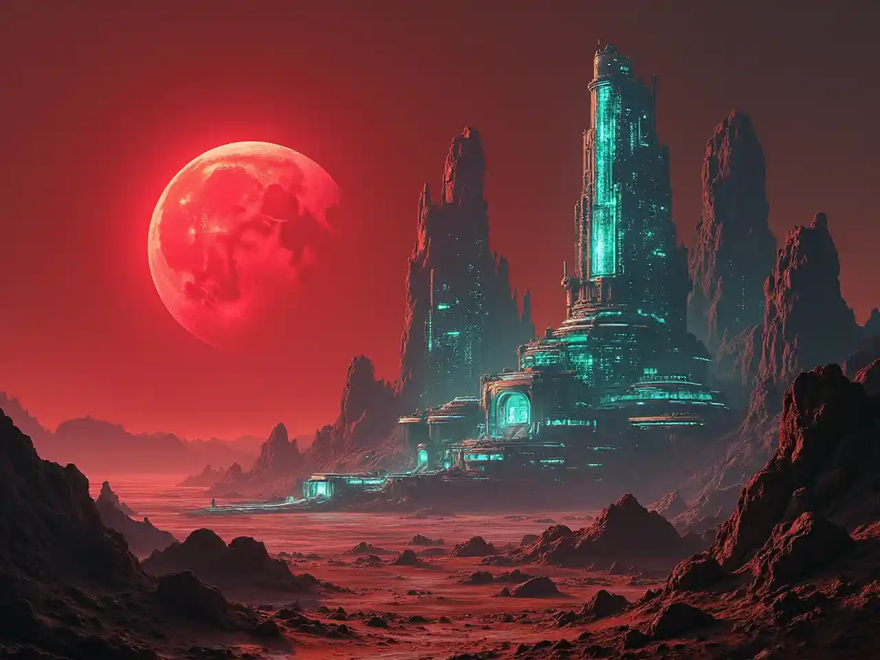 laaaaraमंगल ग्रह पर कांच के विदेशी शहर, लाल चंद्रमा सेट, टर्मिनेटर फिल्म शैली