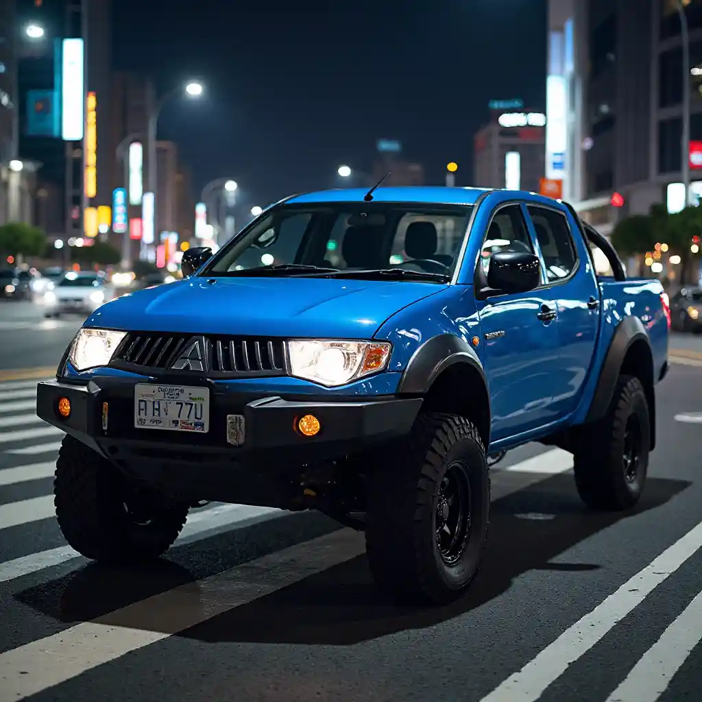 नीली मित्सुबिशी एल200, उठाया, सड़क पहियों के साथ, टोक्यो में रात में फ्रंट बंपर