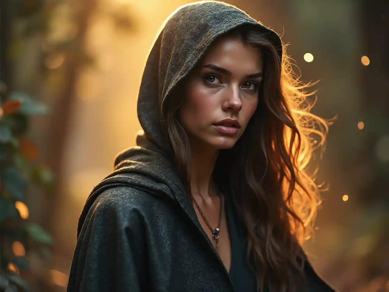 एक शक्तिशाली उपस्थिति वाली एक युवा महिला का आकृति, व्यक्तित्व और चमकते, लगभग देवदूत गुणों से परिभाषित। उनका पहनावा चिकना और स्टाइलिश है, जिसमें एक हुड वाला कोट है जो लालित्य और गर्मजोशी से भरा है। यह जगह रहस्यमय, जादुई लगती है, जिससे महिला का आकर्षण बढ़ता है और वह एक वीर, अन्य दुनिया की रोशनी में आती है।