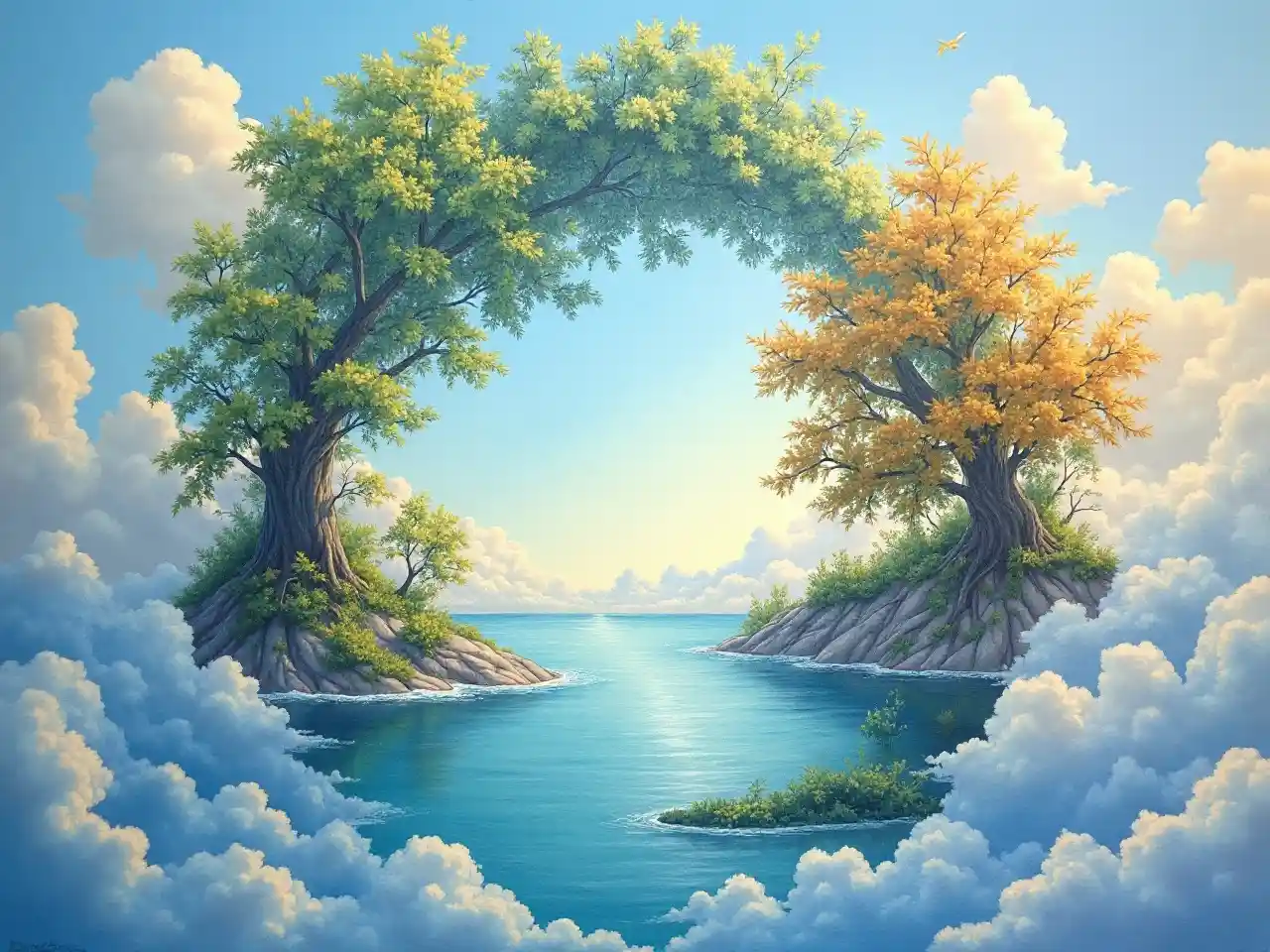 एक (स्वर्ग) और (पानी) का (स्वप्न जैसा वृत्त, प्रत्येक तत्व के साथ) उच्चतम गुणवत्ता पर एक ((स्पष्ट रूप से रंगीन और भावुक चित्रण)) बनाएं। दृश्य को शांत सुंदरता की भावना व्यक्त करनी चाहिए, जैसे कि एक (गतिशील परिदृश्य) को जीवन में लाने वाली (मलमल से विस्तृत कल्पना कला) में कैद किया गया है। आकाश को (अमीर, गर्म रंगों में) चित्रित किया जाना चाहिए जो पानी में नरम रूप से विलय हो जाते हैं, जिससे (सपना जैसा परिवर्तन) होता है। गहरेपन और गति की भावना पैदा करने के लिए पेड़ों को (एक हल्की पेंसिल के साथ स्पष्ट रूप से चित्रित किया जाना चाहिए) और पत्तों को (नम से छाया) होना चाहिए। समग्र रचना में (नरम और सामंजस्य) की भावना होनी चाहिए, जिससे यह विशेष रूप से आकर्षक और (उच्च संकल्प, चौड़ा कोण) के लिए आमंत्रित किया जाता है जो प्रकृति के अनन्त आकर्षण का सार है।