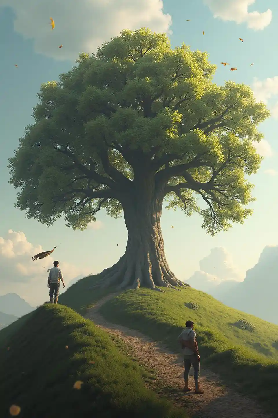 विशाल, अज्ञात लंबाई, और पंख जो आंदोलन की स्वतंत्रता दिखाते हैं, एक विशाल पहाड़ी पर एक प्राचीन पेड़ के सामने खड़े, हवा में उड़ पत्तियां, जैसे कि देख रहा है