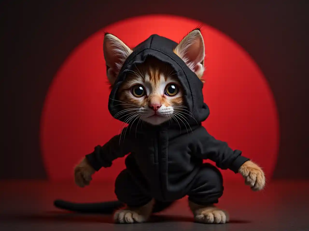 लाल और काले पृष्ठभूमि के साथ निंजा पोशाक में बिल्ली