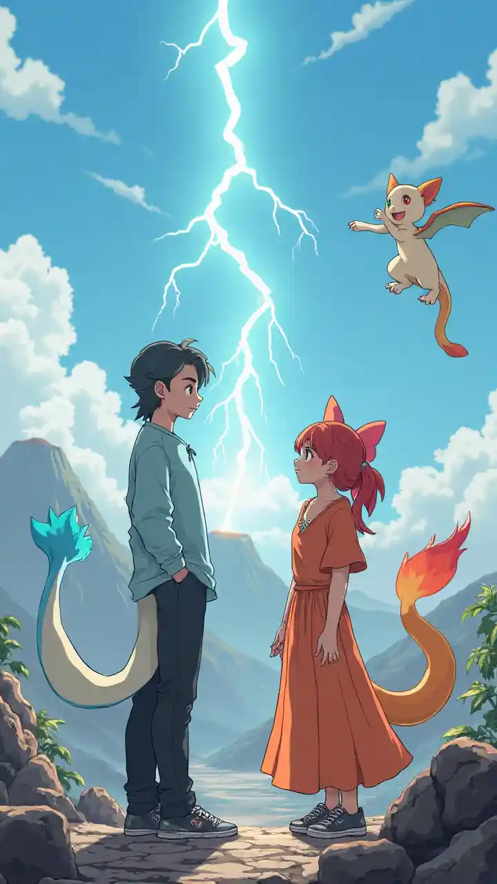 ज्वालामुखी परिदृश्य में मनुष्यों और पोकेमॉन के बीच महाकाव्य मुठभेड़