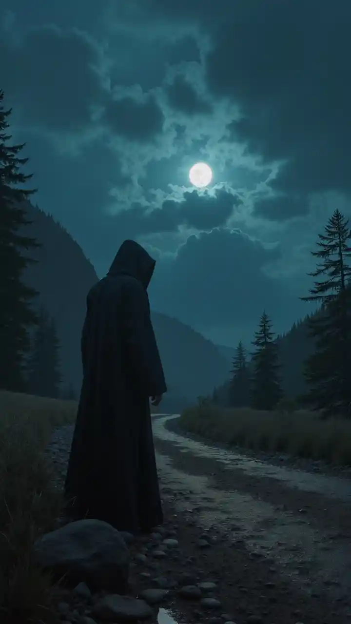 रात में सड़क पर एक चट्टान के पास एक पुजारी