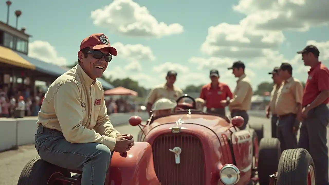 Elijahरेसिंग ट्रैक, पिट स्टॉप, मैकेनिक टीम, अग्रभूमि में रेसिंग कार ड्राइवर, स्टीव मैक्वीन देखो, खुश, धूप का चश्मा, कार के हुड के ऊपर बैठे, विंटेज फोटो, अत्यधिक विस्तृत