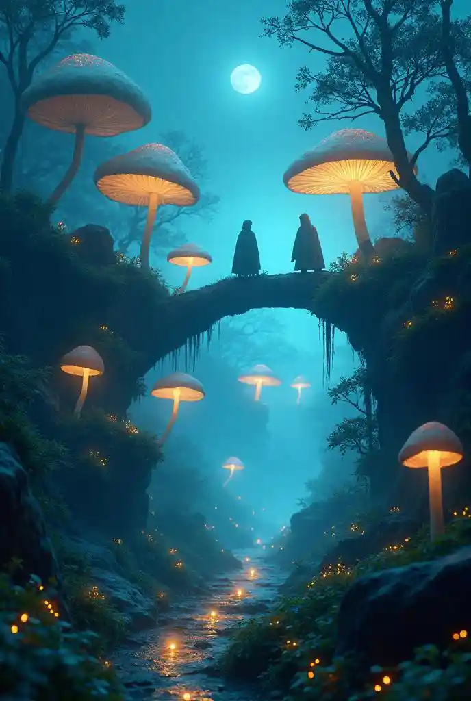 Mwangएक ही बारिश की बूंद के अंदर एक जादुई, जैवदीप्ति वन, चमकते मशरूम के पेड़, क्रिस्टल पुल, नरम कोहरे, चमकते रास्तों पर चलने वाले छोटे-छोटे ढके आंकड़े