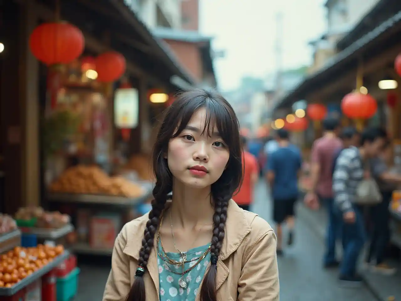 Jacksonपारंपरिक बाज़ार के सामने एक रेट्रो लड़की है। बाजार में भीड़ है। यह तस्वीर 50 मिमी के लेंस के साथ निकॉन एफ 10 कैमरे से ली गई है।