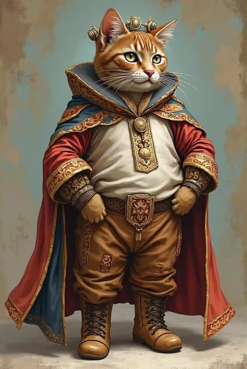 एक बिल्ली राजा की बुलबुला पैंट पहनती है (जैसे कि 4 राजा पोकर कार्ड पर पहनते हैं लेकिन शॉर्ट्स संस्करण में हैं।) तेल की शैली, मध्य आयु के पीछे।
