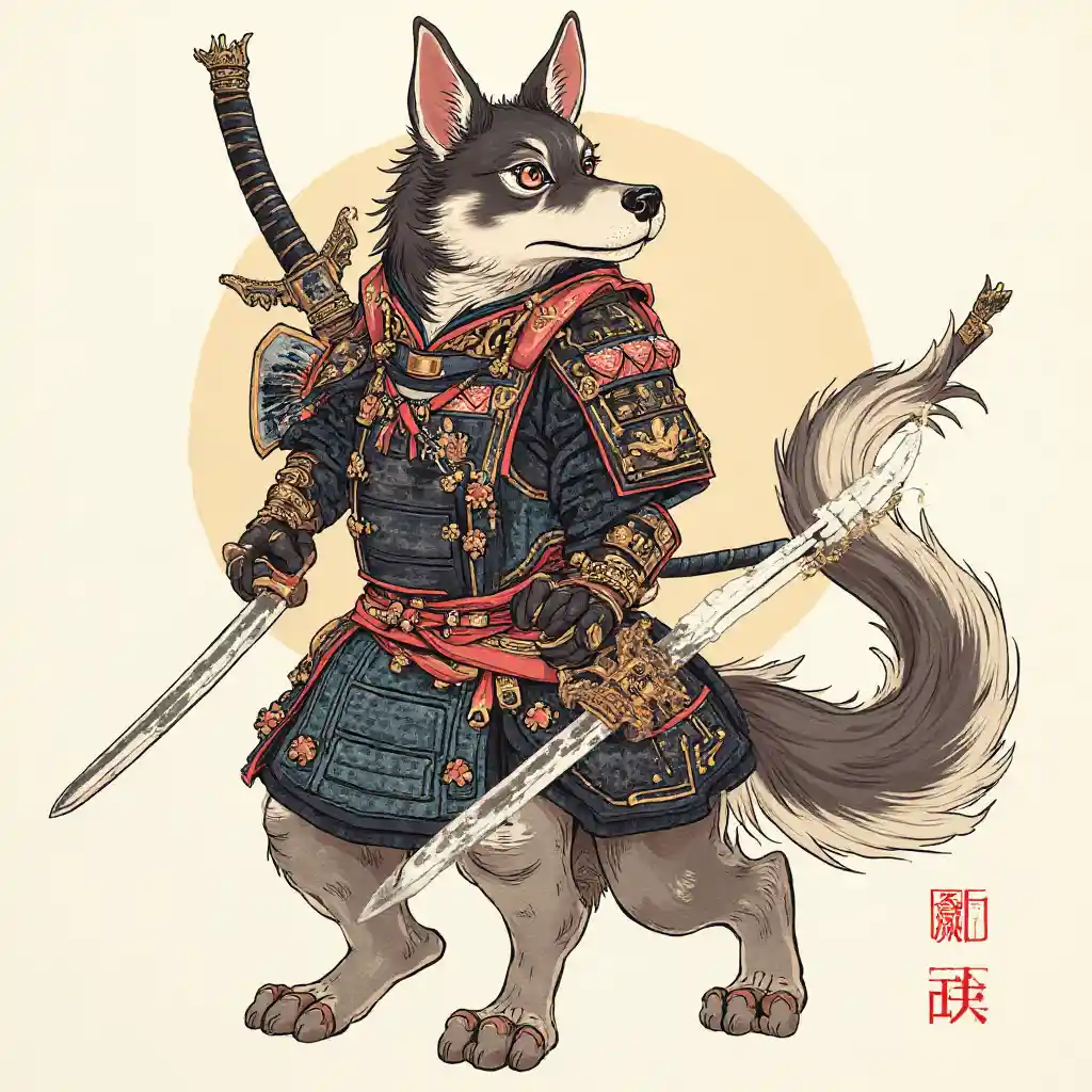 Landonसफेद पृष्ठभूमि पर एक मछली और तलवार वाला कुत्ता, समुराई कुत्ता, कुत्ता योद्धा, बख्तरबंद कुत्ता, मानव रूपी कुत्ता निंजा, कनो तन्य द्वारा, बहुत विस्तृत और रंगीन, उकीयो की कला शैली में, उटागा कुनिओशी से प्रेरित है