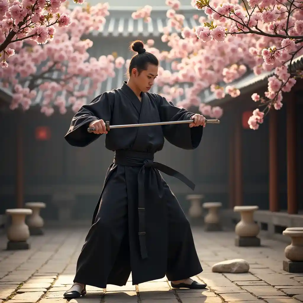 एक समुराई के आंगन में तलवार नृत्य करते हुए, 20 के दशक में एक एशियाई व्यक्ति काले रंग में चमकता है। चेरी के फूल और पत्थर के लालटेन उसे ढालते हैं, उनकी सटीक चाल भयंकर, सुरुचिपूर्ण ऊर्जा को उज्ज्वल करती है।