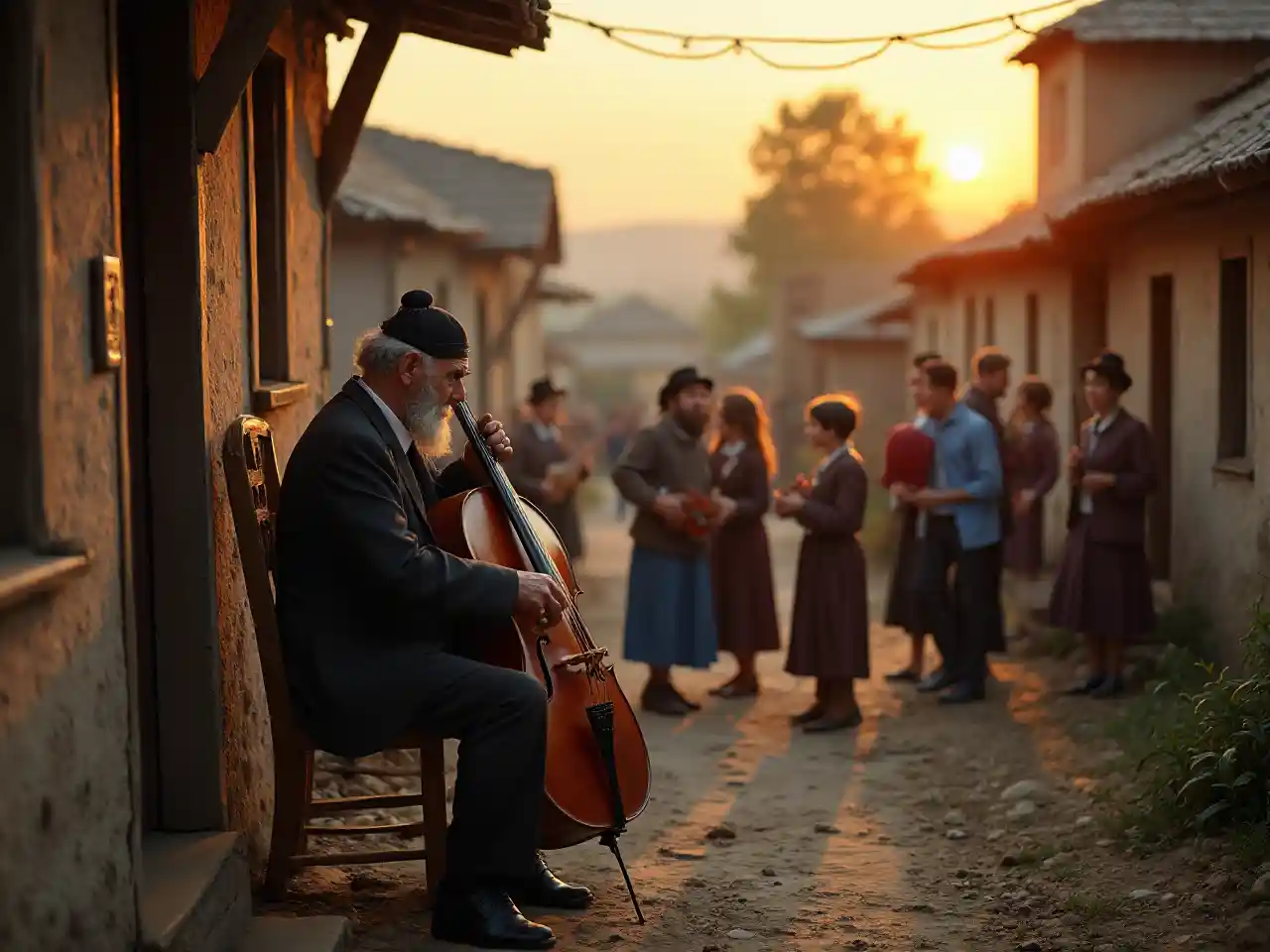 श्टेल में एक उदासीन शाम, पूर्व यूरोप में देर दोपहर में देर शाम में बदलाव, श्टेल, एक गर्म, सुनहरे सूर्यास्त के साथ स्पष्ट आकाश, एक बूढ़े आदमी गहरी भावना के साथ एक सेलो खेल रहा है, एक कप्पा सहित पारंपरिक यहूदी पोशाक, अपने घर के बाहर एक लकड़ी की कुर्सी पर बैठे, पुरुष उत्साह से नृत्य और वायलिन, एकॉर्डियन, क्लेरनेट जैसे उपकरण खेल रहे हैं, सरल देहाती कपड़े, एक चक्र के चारों ओर एक वृद्ध, बच्चों को खेल और नृत्य, चक्र के बाहर, कुछ वयस्कों की नकल, कुछ ताल या गाना, पारंपरिक कपड़े, घरों के पास खड़े, कुछ खिड़कियों से बाहर देख रहे हैं, चौड़ा कोण, बूढ़े पर तेज फोकस, आसपास की गतिविधियों पर नरम फोकस, सूर्यास्त से प्राकृतिक प्रकाश, लंबी छायाएं और प्रकाश चेहरे, उच्च संकल्प, आनंदमय लेकिन उदासीन