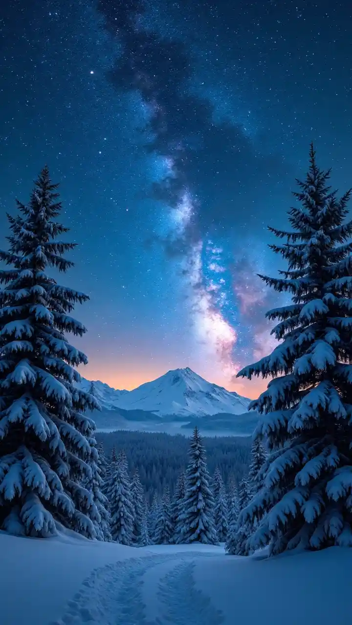 Chloeएक बर्फ का जंगल, आकाशगंगा के साथ विशाल रात का आकाश
