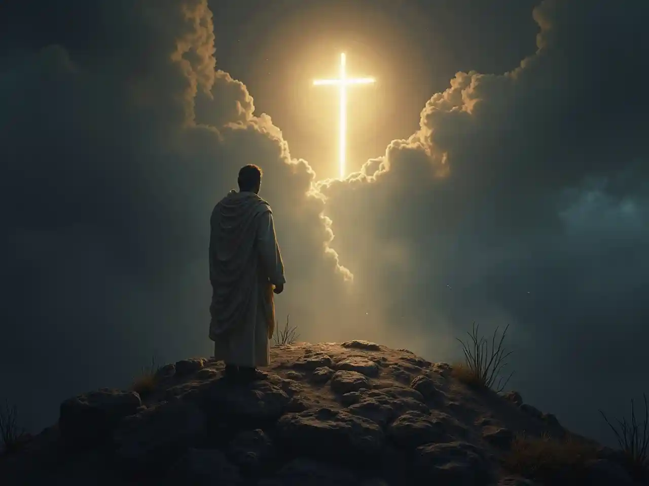 यीशु पूरी तरह से प्रकाश के बीच में उतर रहा है, एक आदमी एक पहाड़ पर इंतजार कर रहा है एक भूरे अंधेरे के बीच में और उसके माता की आत्मा है