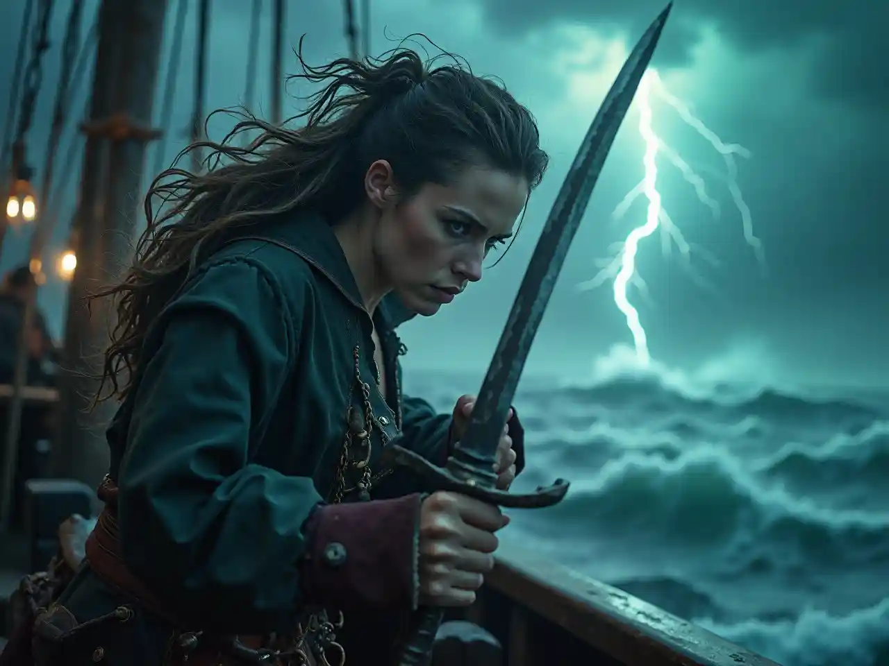 "एक महिला समुद्री डाकू, कैरेबियन के समुद्री डाकू से प्रेरित एक दृश्य में नायक, एक पुराने समुद्री डाकू जहाज के डेक के किनारे पर खड़ी है क्योंकि एक भयंकर तूफान उसके चारों ओर है। समुद्र में झाग है, लहरें जहाज के किनारों पर जोर से मार रही हैं, और आकाश में बिजली से फट रहा है। उसके बाल गीले हैं और उसके चेहरे पर झटका लगा है, जो तनाव और दृढ़ता से भरा है। वह अपने हाथ में एक पुरानी समुद्री तलवार को कसकर पकड़ती है और तूफान के भीतर एक अदृश्य दुश्मन की ओर देखती है। कैमरा का कोण कम और थोड़ा सा साइड से है, जिससे उसके रुख में भव्यता और संकल्प पर जोर मिलता है। वातावरण अंधेरा है, एड्रेनालाईन और महाकाव्य तीव्रता से भरा है, जैसे यह लड़ाई से पहले है। प्रकाश बहुत ही शानदार है, उसके चेहरे और उसके कपड़े के धातु विवरणों को बिजली से प्रकाशित किया गया है।