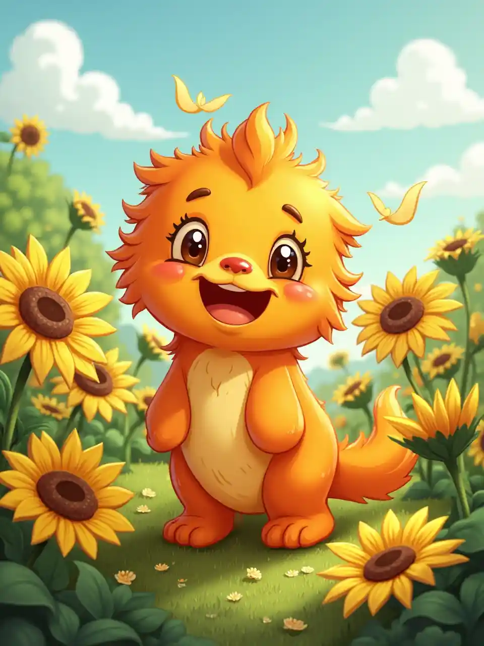 एक जीवंत नारंगी कार्टून चरित्र सूरजमुखी के साथ एक बगीचे में खुश है।
