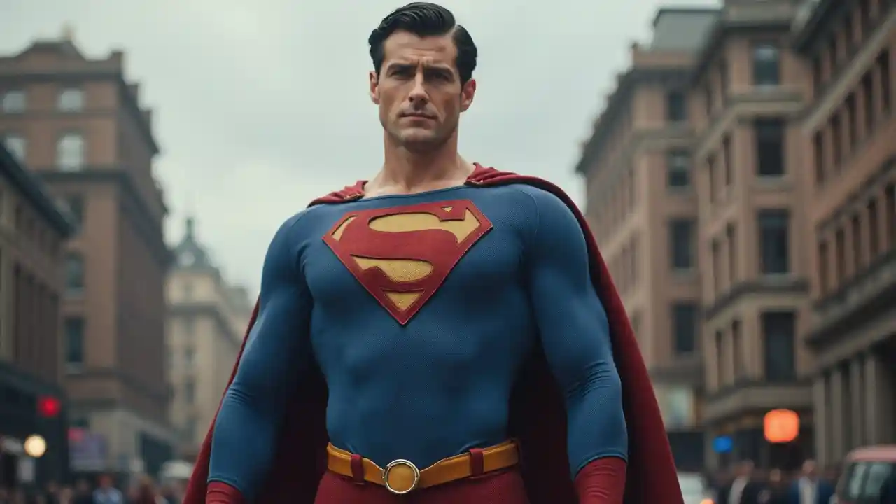 छाती पर सुपरमैन लोगो के साथ आकाश नीले सूट में 1940 के दशक के सुपरमैन का चित्र, नारंगी बेल्ट, गहरे लाल कोट, लाल जूते, पृष्ठभूमि में शहर, धुंधली पृष्ठभूमि, पेशेवर शॉट, उज्ज्वल संतरित रंग, तेज फोकस, अत्यधिक विस्तृत
