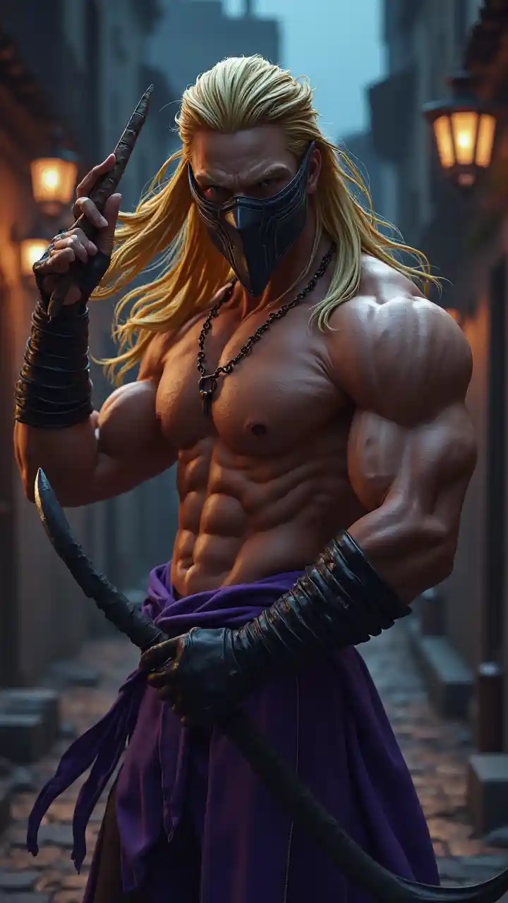 स्ट्रीट फाइटर से वेगा का अल्ट्रा-रियलिस्टिक चित्र, एक सुंदर स्पेनिश निंजा एक आधा-चेहरे का धातु मुखौटा और बैंगनी पट्टा पहने हुए, लंबे श्यामला बाल, एक मांसल, एथलेटिक बिल्ड के साथ, एक हाथ पर अपने प्रतिष्ठित पंजा के साथ एक नाटकीय मुद्रा में। रात में अंधेरी, मूडी गली या सजावटी स्पेनिश छत में सेट। तीव्र सिनेमाई प्रकाश व्यवस्था, तेज विवरण, यथार्थवादी त्वचा बनावट, गतिशील छाया, क्षेत्र की गहराई, 4K रिज़ॉल्यूशन, फोटोरियलिज्म, पेशेवर चरित्र अवधारणा शैली।