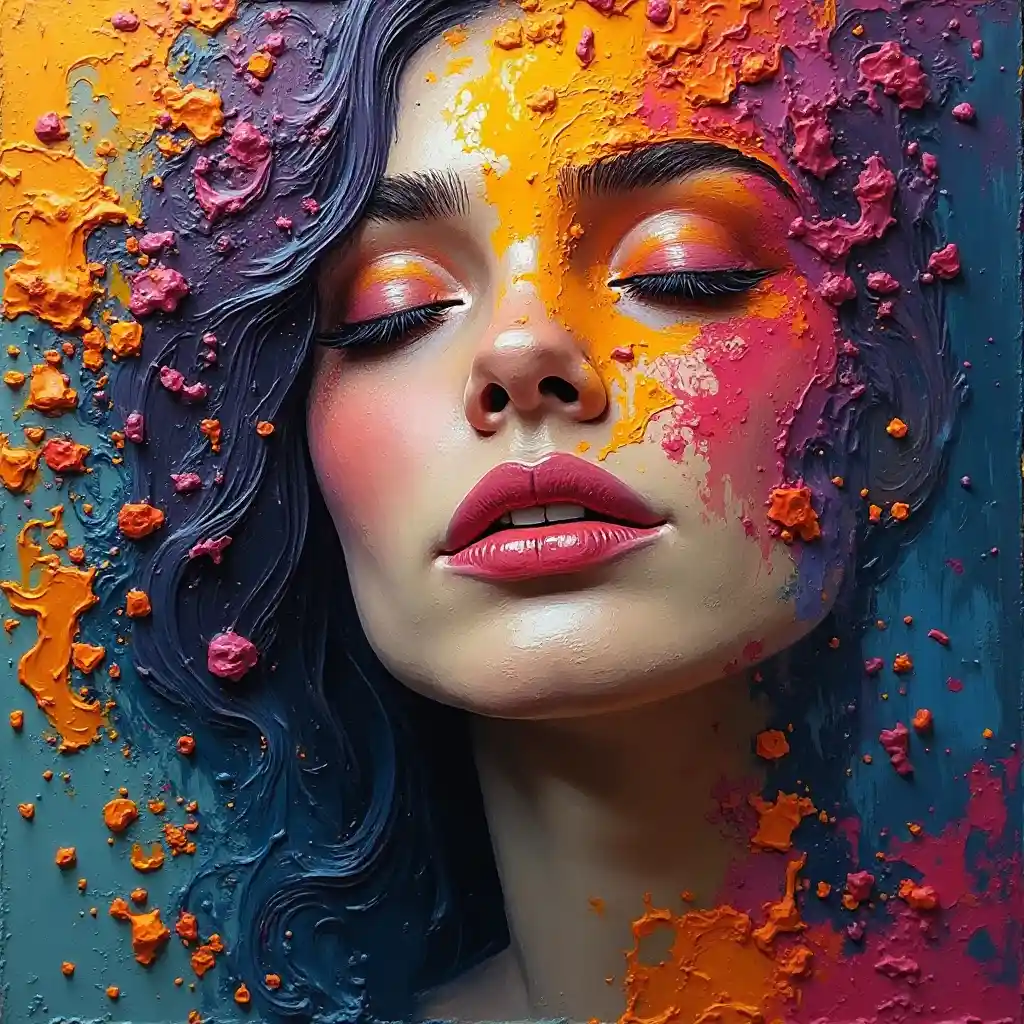 यह छवि एक प्रभावशाली और भावुक रूप से भावुक अमूर्त चित्र है। यह एक महिला के चेहरे को आंशिक रूप से अवरुद्ध और तेल के रंगों और रंगों के एक जीवंत चक्र में मिश्रित करता है। उसकी आँखें बंद हैं, जिससे शांतिपूर्ण या आत्मनिरीक्षण अभिव्यक्ति होती है। पेंच स्ट्रोक मोटे और अभिव्यक्तिपूर्ण हैं, जो बाएं ओर गहरे नीले और बैंगनी रंग के साथ आग वाले नारंगी और पीले रंग के मिश्रण हैं। लाल रंग के स्पलैश होंठों और गालों के पास नाटकीय तीव्रता देते हैं। इम्पैस्टो तकनीक के भारी उपयोग के कारण पेंटिंग में बनावट, लगभग मूर्तिकला महसूस होती है, जिससे इसे गति और भावना की एक शक्तिशाली भावना मिलती है।