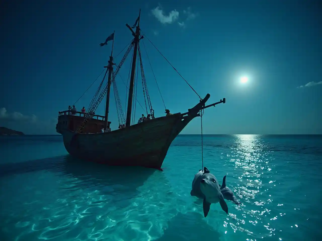 पूर्ण चन्द्रमा के समय बाहामा द्वीपों के तट पर विंग जहाज फंसे हुए नीले पानी. माल्टीज़ कुत्ता जहाज के अंदर छिप रहा है. डॉल्फिन समूह को देखने के लिए रुकता है.