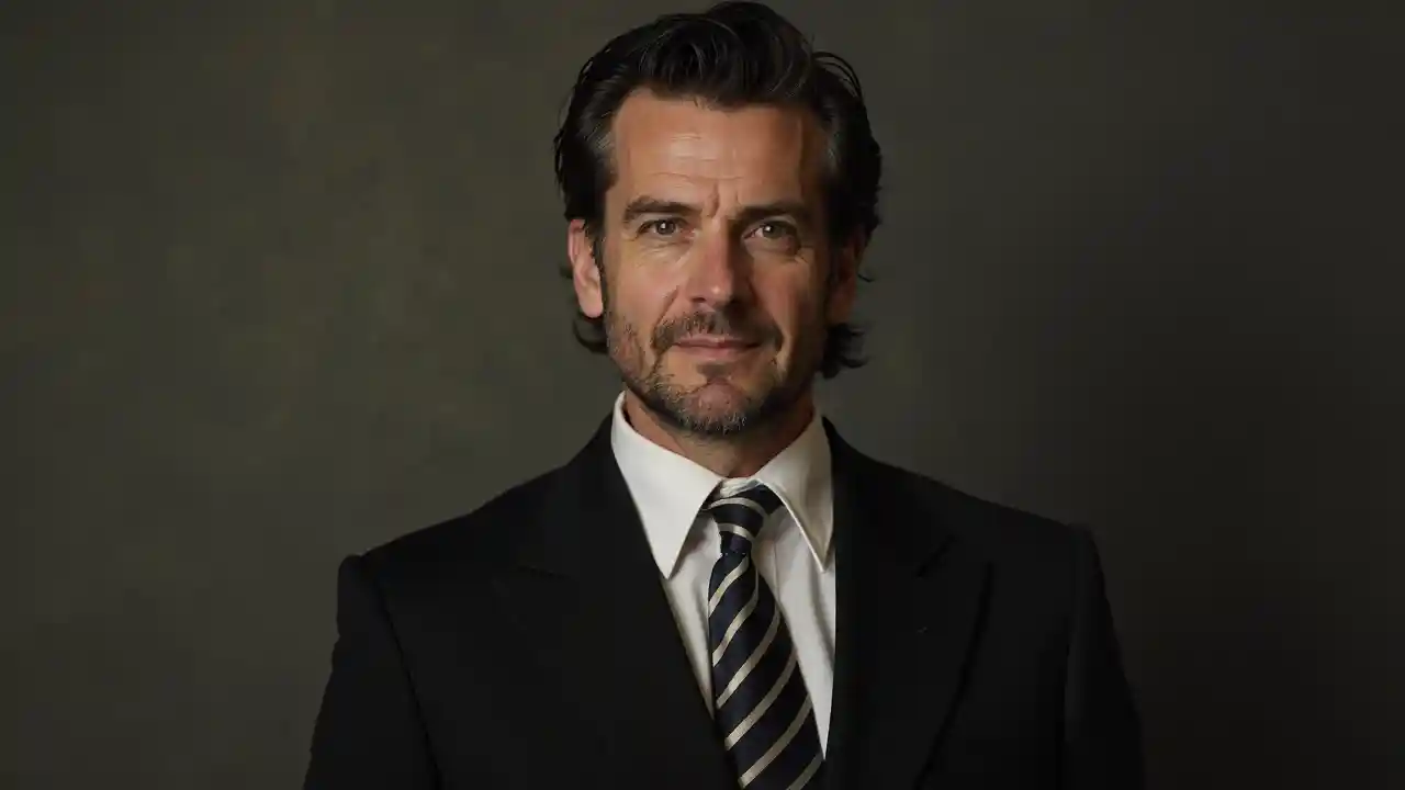 काले सूट और धारीदार टाई में एक आदमी की विंटेज तस्वीर