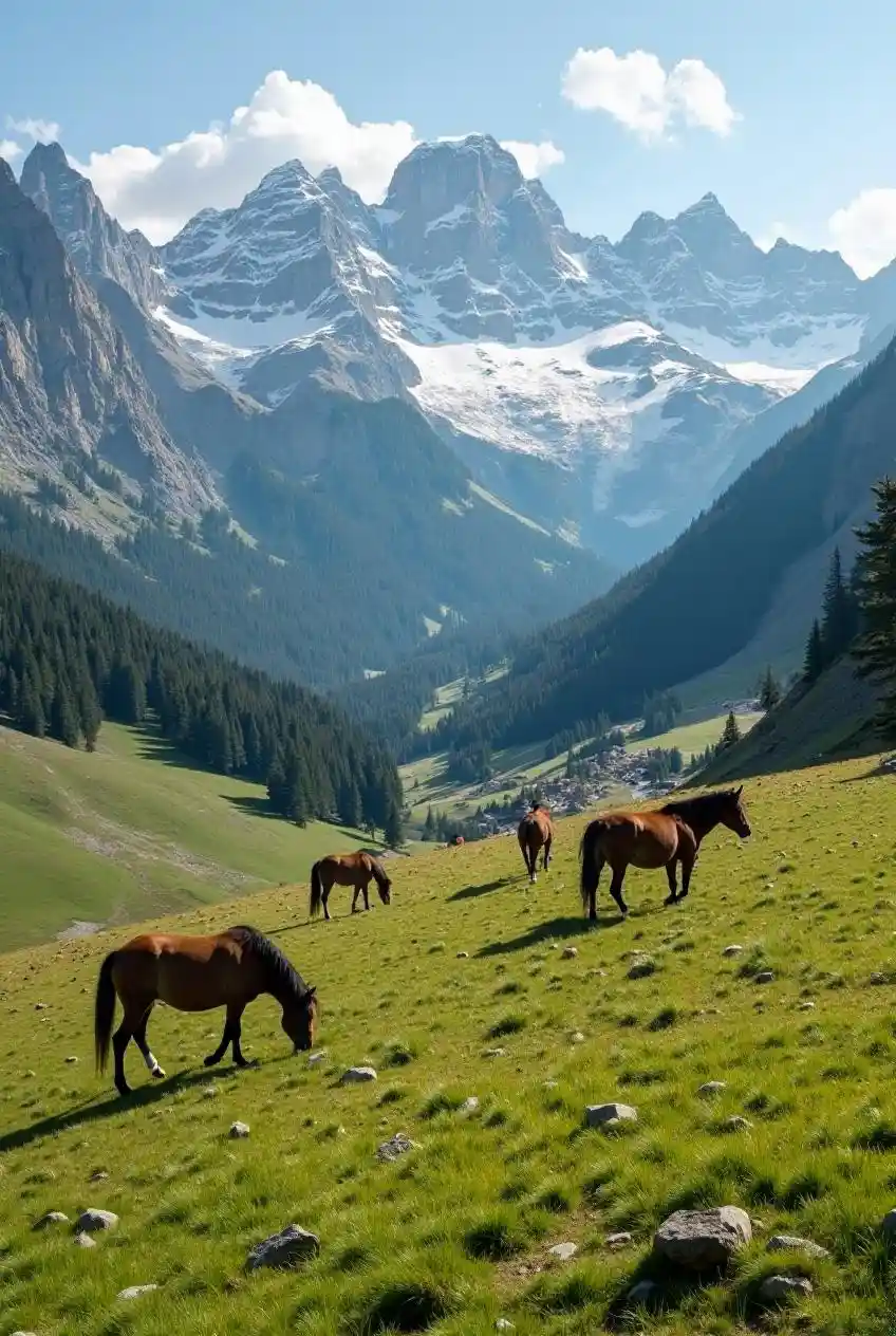Grand alpine meadows, with wild horses grazing beneath snow-capped peaks.