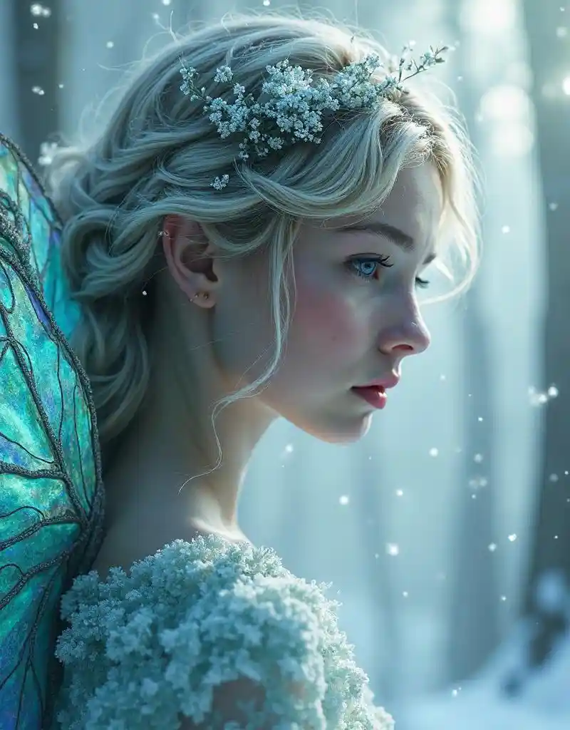 अति विस्तृत दोहरे प्रकाश, बुजेगोस का शीतकालीन परी चित्र, नाजुक सुसंगत चेहरा, (सुंदर इरिसेंट पंख), एक रहस्यमय जंगल से घिरा हुआ है