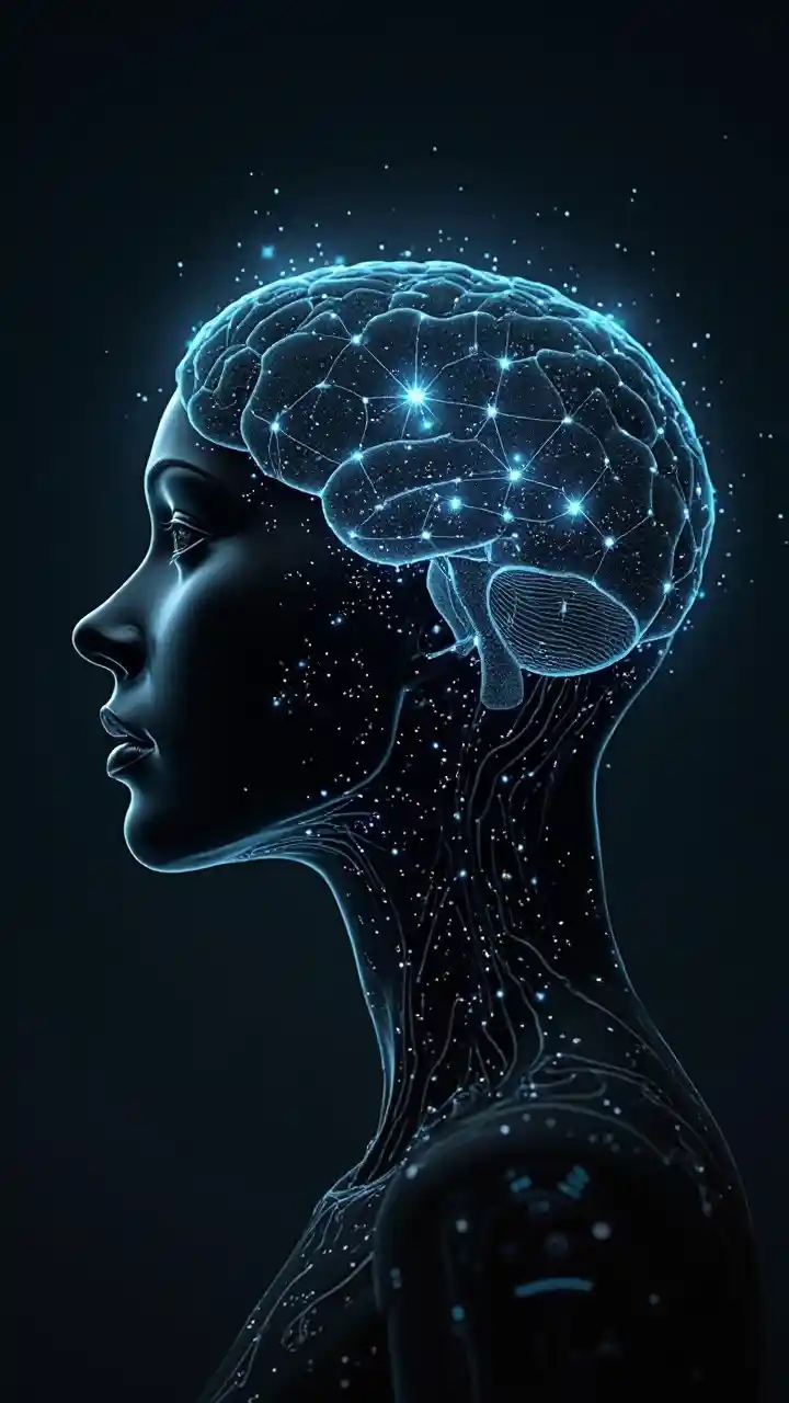 Membuat sampul buku hitam AI untuk manajemen bisnis dan pemasaran media sosial. Gambar sampul harus menyerupai manusia, dengan kepala transparan, dan otak robot dapat dilihat melalui kepala sebagai sampul Vogue