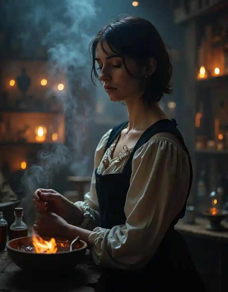 Malam, abad pertengahan, seorang wanita petani muda, rambut pendek gelap, dipangkas hitam, kembali, mengenakan pakaian pertanian kuno di laboratorium alkimia, penyebaran asap, masterpi