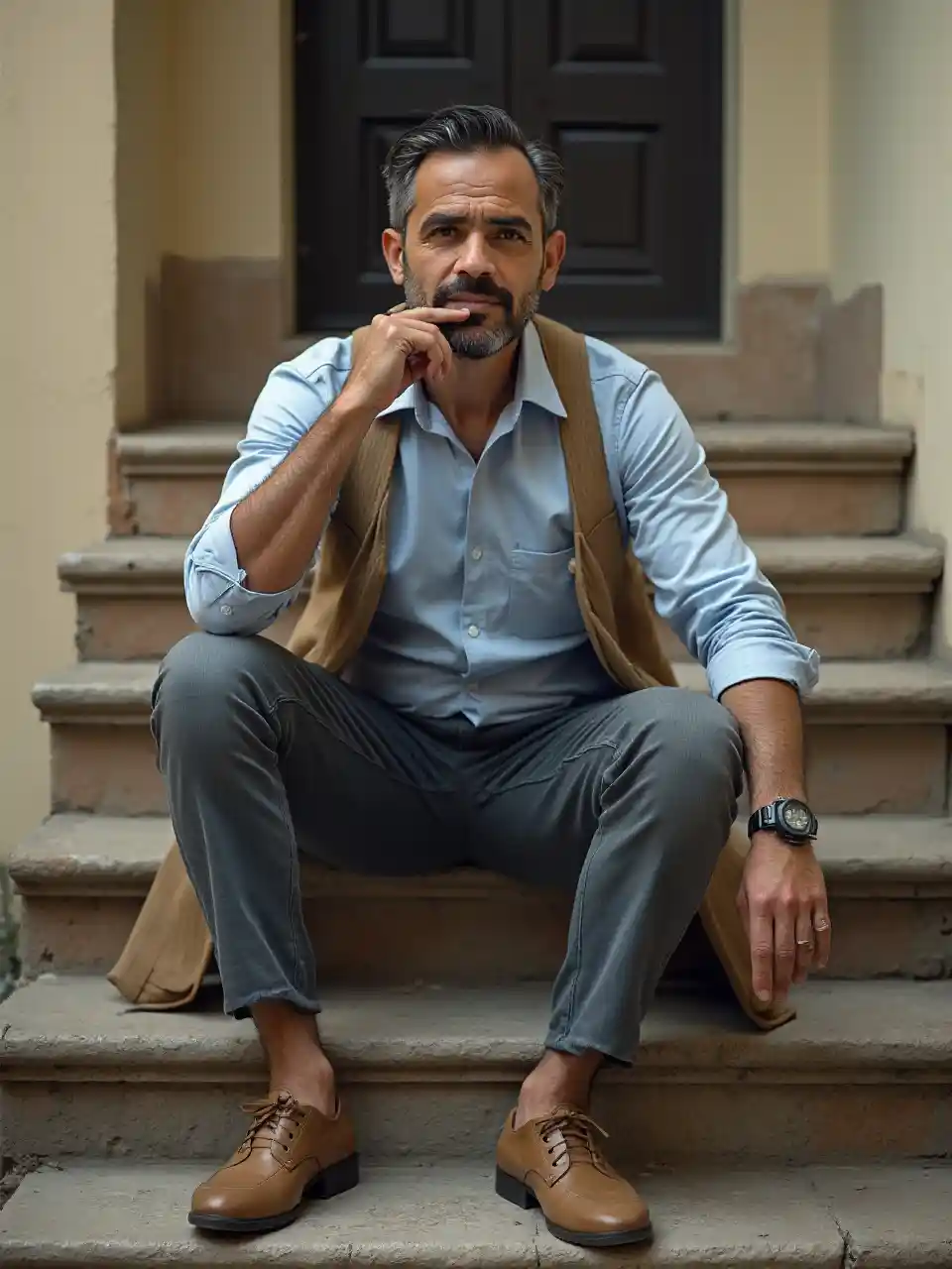 Seorang pria duduk di atas kumpulan anak tangga, kaki disilangkan, tangan menopang dagu, kaki menyentuh tanah, Altoon Sultan, hurufiyya, foto profesi, potret orang