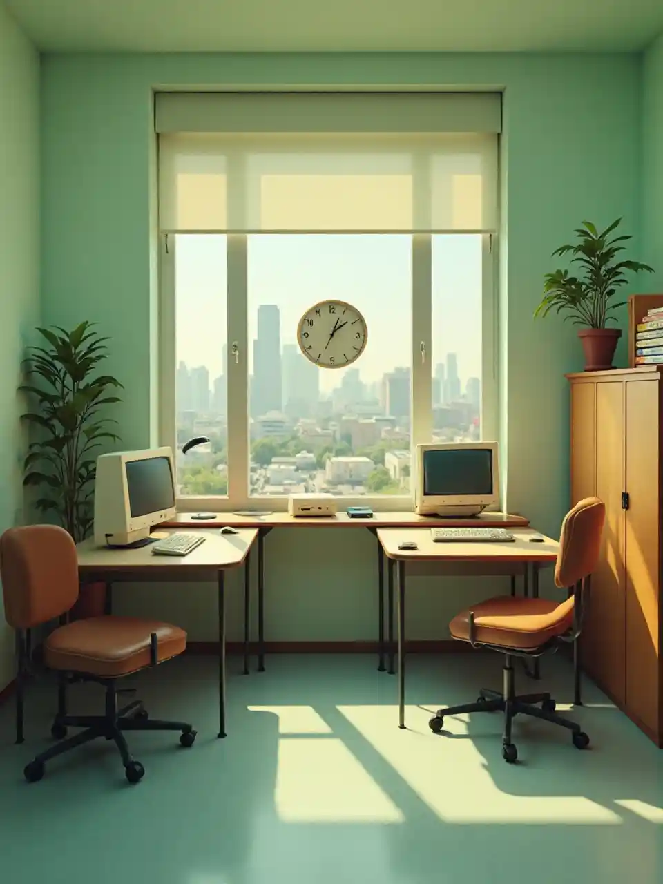 Dalam adegan yang mengingatkan pada film Nine-to-Five, kita menemukan diri kita di kantor bergaya retro, bermandikan palet Wes Anderson yang lembut. Komposisi kantor simetris, khas pekerjaan Anderson, dengan dua workstation identik. Setiap meja dilengkapi dengan monitor komputer kuno dan keyboard, lengkap dengan kursi putar. Jendela-jendela besar, yang menggambarkan arsitektur kota yang jauh, mengapit jam dinding antik, seolah-olah membeku di masa lalu. Di sebelah kanan, sebuah lemari tinggi berisi binder dengan tanaman pot di atasnya, membangkitkan sedikit nostalgia. Koreografi yang cermat dan latar belakang hijau yang lembut berkontribusi pada perpaduan yang harmonis antara pesona retro dan komposisi film.