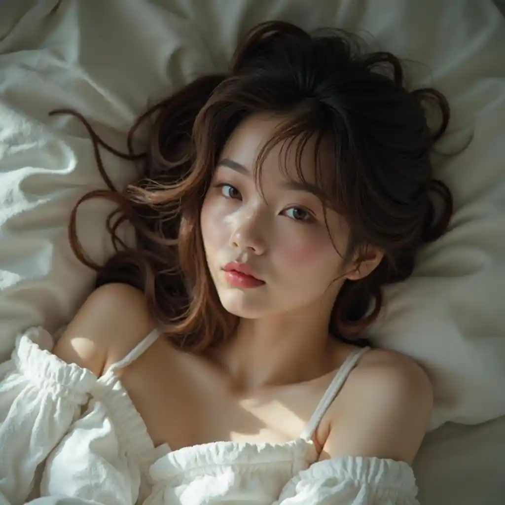 Luna(Kualitas gambar terbaik). Kualitas gambar terbaik.) Wanita muda dengan wajah yang lebih cantik dari aktris cantik. Dia memiliki sayap malaikat. Berbaring di tempat tidur. Wajah yang paling indah ada di