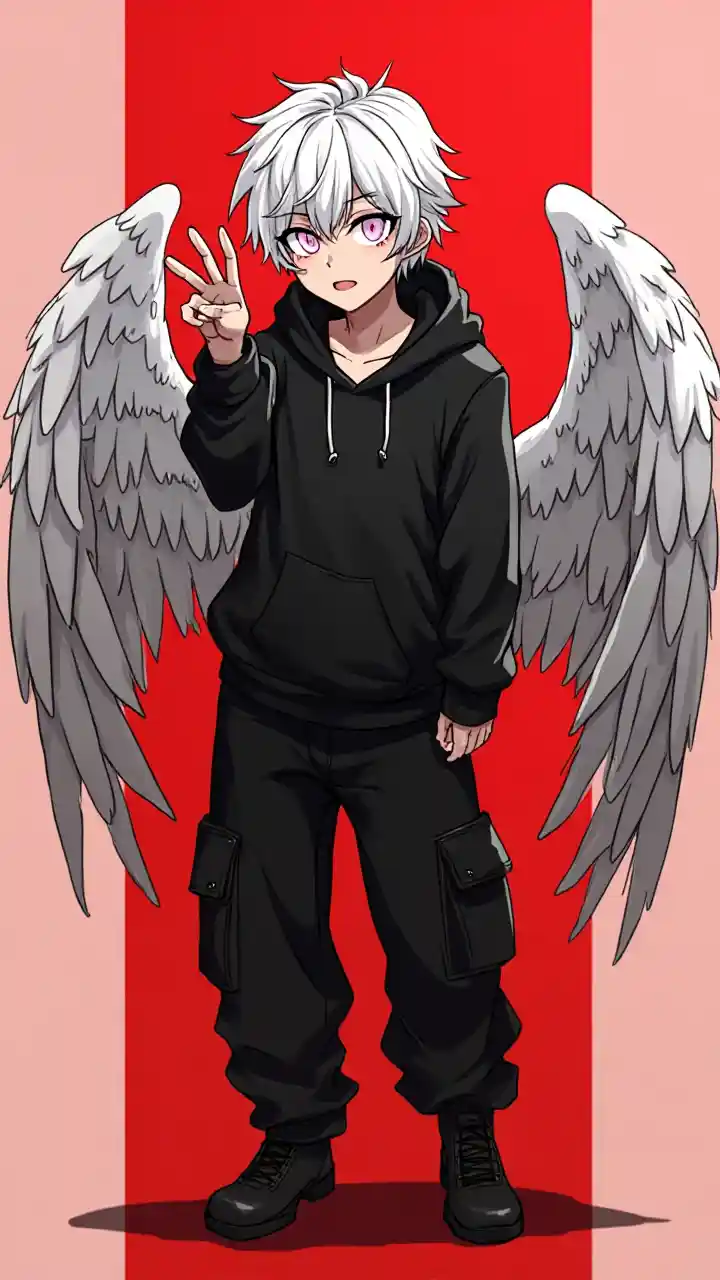 Siluet hitam, mata pink pucat untuk anak laki-laki berambut putih, sayap malaikat di punggung, pakaian serba hitam, celana kargo, lima jari di setiap tangan: 1.2), mahakarya, 4k, kualitas terbaik, seni anime → membuat latar belakang hanya merah polos