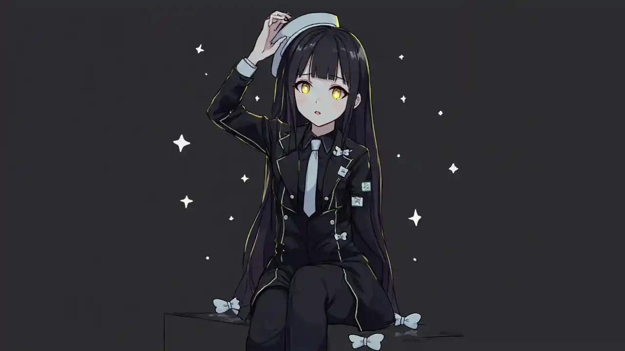 source _ anime,illustration,delicated features,simple background,illustration,high definition,masterpiece,dark _ theme,black _ theme,grey _ theme,[ 1girl,solo,long hair,looking at viewer,bangs,1girl,solo,petite,looking at viewer,source _ anime,illustration,delicated features,illustration,Definisi tinggi, masterpiece, [tema abu-abu gelap (1.2)], cantik, mata halus, latar belakang sederhana, wajah halus, mata halus, cantik, mahakarya, [oleh x Setelan jas bergaris pin dasi Kecil mungil fczj xxx667 _ illu bercahaya banyak busur Warna sederhana hitam _ Kecil _ Ular putih _ Kontur datar _ Warna datar _ Warna duduk panjang _ Setelan mahakarya Kualitas luar biasa Pov sangat panjang jika dilihat dari bawah _ Kecil _ Kepang keriting) Dari _ Angkat dari belakang _ 1 siku Angkat kaki Pegang kaki