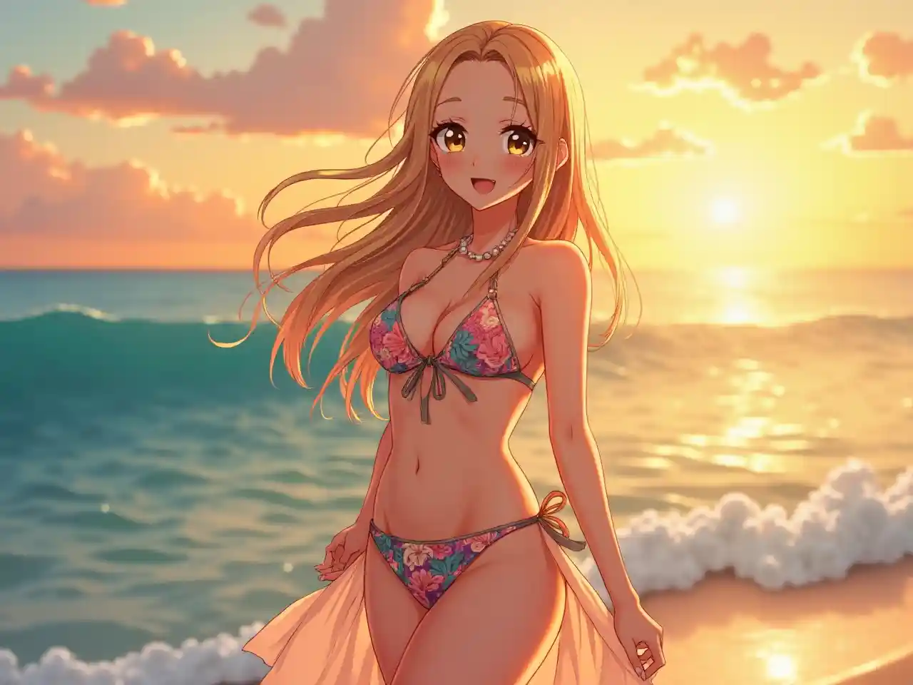Gadis anime ultra HD dengan gambar skala besar horizontal, flamboyan dan menawan, mandi di bawah matahari terbenam keemasan, berdiri di pantai dengan ombak yang menghantam, mengenakan pakaian renang tropis dengan garis leher yang dalam, mengenakan celemek murni, rambut panjang tergerai di angin laut dengan senyum hangat, mata besar bersinar, kulit mulus, palet oranye-biru yang hangat, fitur wajah yang elegan, riasan sempurna, suasana petualangan yang damai, cahaya lembut dan pencahayaan alami, Menampilkan dadanya yang menarik dan terdefinisi dengan baik dan belahan dada yang halus, serta kaki yang ramping dan proporsional dan postur yang santai, memancarkan kecantikan dan vitalitas.