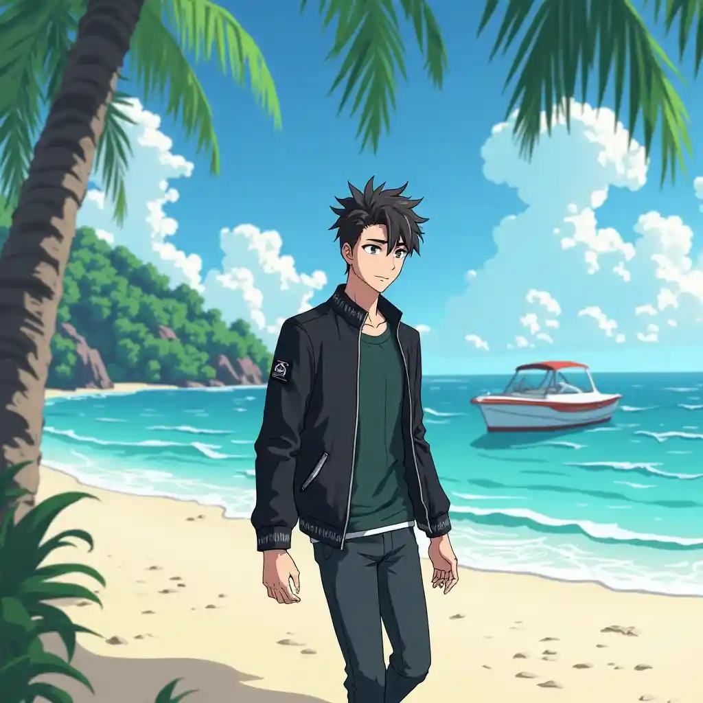 Seorang pria kartun dengan gaya rambut unik dan jaket hitam berjalan di pantai tropis dekat perahu kecil dan pohon palem.