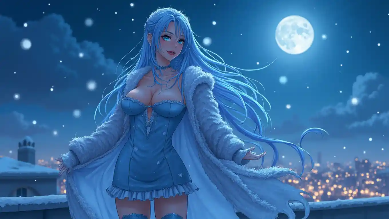 Gadis anime ultra HD dengan gambar skala besar horisontal, luar biasa cantik dan magis, bersinar di bulan purnama, berdiri di luar ruangan di atap bersalju dengan lampu kota di bawahnya, mengenakan mantel trim bulu, mengenakan gaun ketat dengan garis leher yang menggantung rendah dan stoking setinggi paha, rambut panjang berkilauan dengan embun beku dan senyum damai, mata berkilau lebar, kulit bercahaya, palet biru dan perak yang dingin, fitur wajah yang tajam, riasan tanpa cela, suasana magis dan romantis, Cahaya lembut dan pencahayaan atmosfer, menyoroti dadanya yang menarik dan terdefinisi dengan baik dan belahan dada yang halus, serta kaki yang panjang dan kencang dengan sikap tenang, memancarkan misteri dan keindahan.