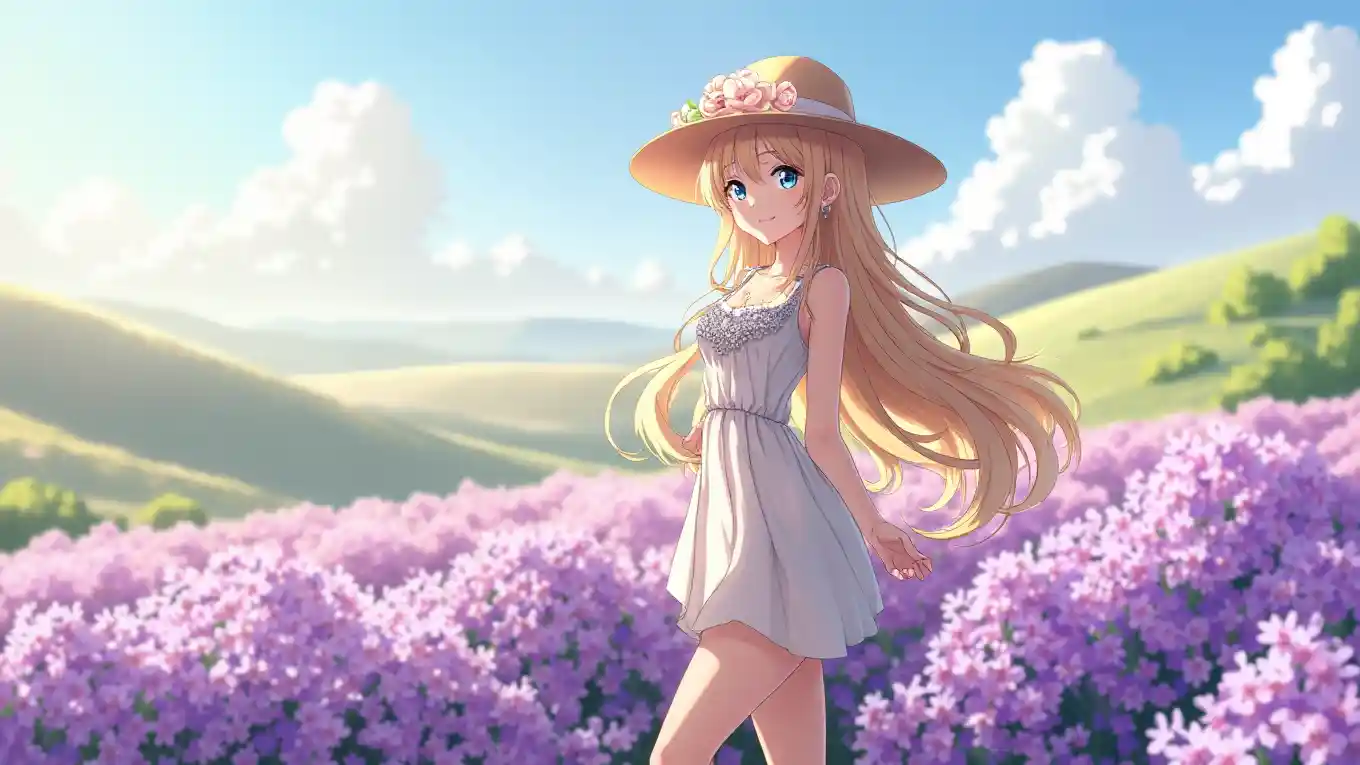 Gadis anime ultra definisi tinggi dengan gambar skala besar horizontal, mencolok dan menggoda untuk mengambil napas, matahari terbit, berdiri di luar lavender di perbukitan bergulir, mengenakan pakaian musim panas, leher jatuh, topi bertepi lebar di kepala, rambut panjang dihiasi dengan bunga dan senyum bercahaya, mata besar berkilau, kulit bersinar, palet warna ungu dan hijau lembut, fitur wajah halus, riasan sempurna, suasana romantis yang tenang, cahaya lembut dan pencahayaan alami, Menyoroti dadanya yang seksi dan dipahat dengan belahan dada yang halus, serta kaki yang kencang dan panjang dengan postur yang indah, memancarkan kecantikan dan pesona.