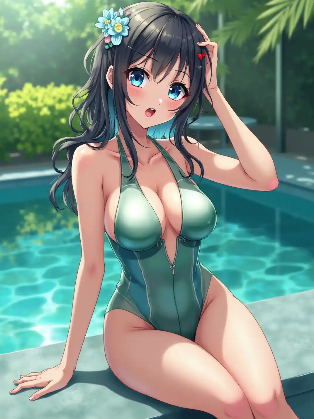 Gambar skala besar vertikal dari seorang gadis anime Ultra HD, menakjubkan cantik dan percaya diri, berjemur di bawah sinar matahari, berbaring malas di samping kolam renang luar ruangan di lingkungan tropis, mengenakan pakaian renang metalik dengan leher jatuh, wig bunga di kepala, rambut basah yang melekat pada kulit, mengungkapkan senyum percaya diri, kulit berkilau dengan mata besar, palet biru-hijau yang bersemangat, fitur wajah yang tajam, riasan sempurna, suasana mewah dan menyegarkan, cahaya lembut dan pencahayaan alami, Menonjolkan payudaranya yang menarik dan dipahat dengan belahan dada yang halus, serta kaki yang panjang dan kencang dalam pose yang santai, memancarkan kecantikan dan kepercayaan diri.