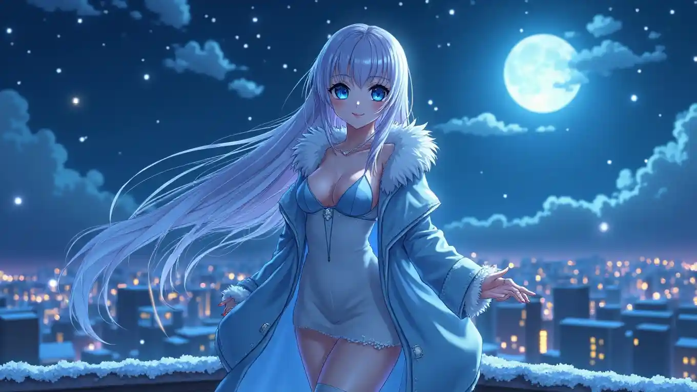 Gadis anime ultra HD dengan gambar skala besar horizontal, kecantikan dan magis yang menawan, bersinar di bulan purnama, berdiri di luar ruangan di atap bersalju dengan lampu kota di bawahnya, mengenakan mantel trim bulu, gaun ketat dengan garis leher yang menggantung rendah dan stoking setinggi paha, rambut panjang berkilauan dengan es dan senyum damai, kulit berkilau dengan mata besar, palet biru dan perak yang dingin, fitur wajah yang lembut, riasan tanpa cela, suasana romantis magis, Cahaya lembut dan pencahayaan atmosfer, menyoroti dadanya yang menarik dan terdefinisi dengan baik dan belahan dada yang halus, serta kaki yang panjang dan kencang yang memancarkan misteri dan keindahan.