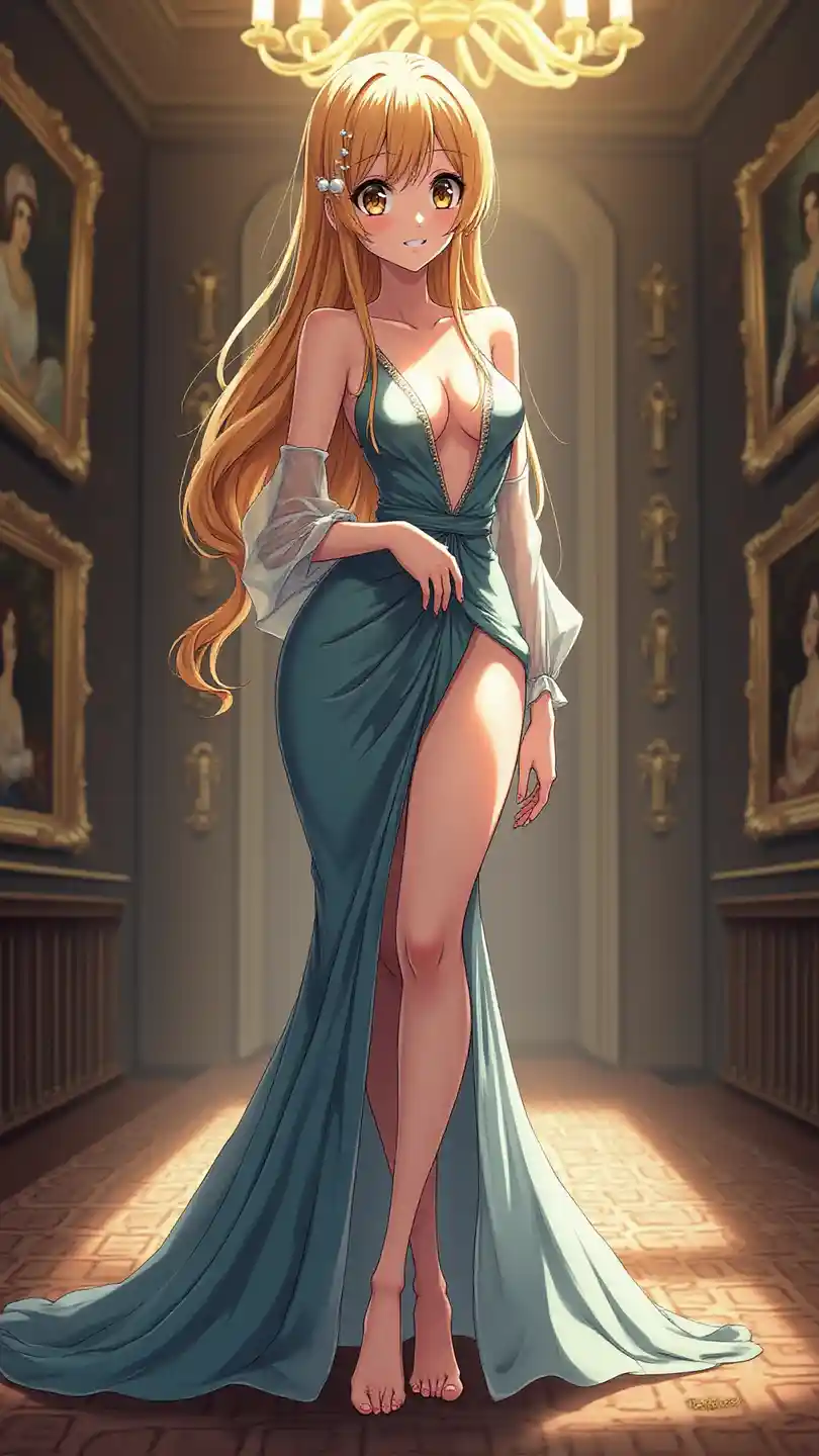 Gadis anime ultra definisi tinggi dengan gambar skala besar vertikal, berseri-seri kecantikan dan sensual, di bawah pencahayaan lampu gantung, berdiri di galeri seni interior lukisan klasik, mengenakan gaun malam mewah, leher jatuh, lengan menyeluruh, rambut panjang dihiasi dengan kartu rambut mutiara dan senyum lembut, mata besar berkilau, kulit bercahaya, palet biru keemasan yang dalam, fitur wajah yang elegan, riasan tanpa cela, suasana yang halus dan artistik, cahaya lembut dalam cahaya hangat, Menyoroti daya pikatnya, payudaranya yang dipahat dengan belahan dada yang halus, kaki yang panjang dan kencang memiliki postur yang tenang, memancarkan pesona dan keanggunan.